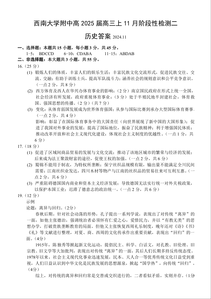 重庆市西南大学附属中学2025届高三上学期11月阶段性检测(二)历史答案