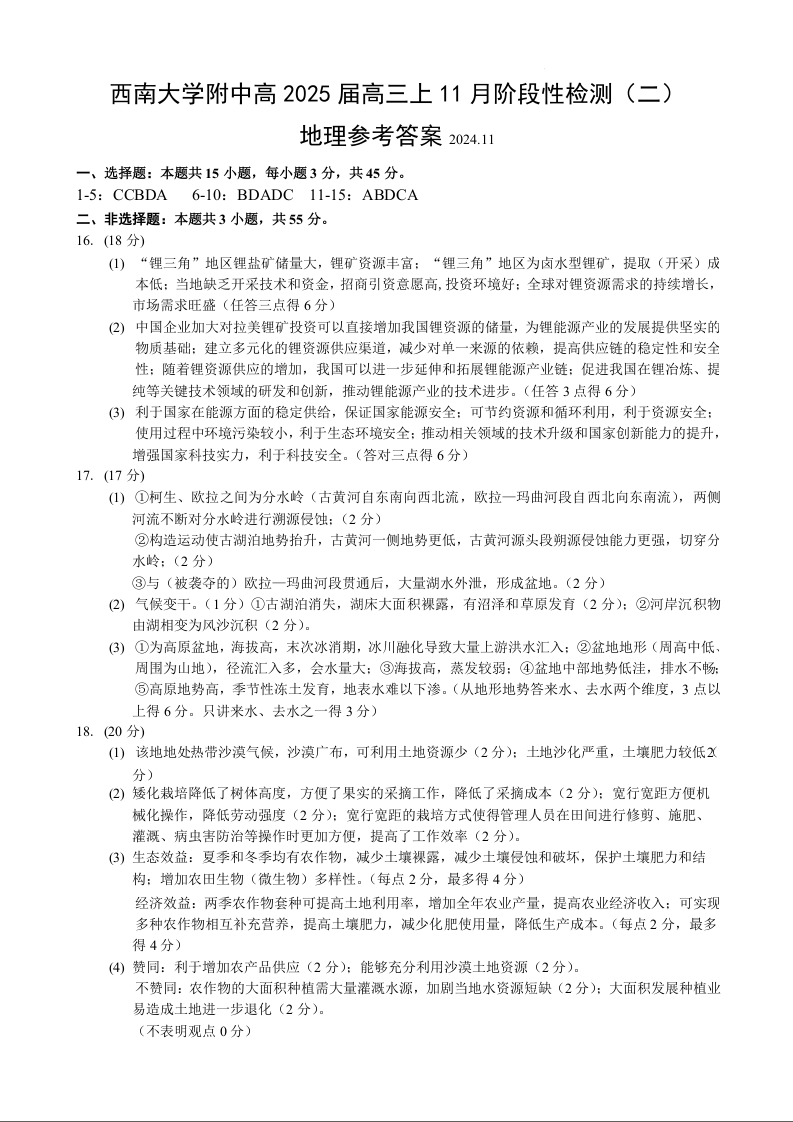 重庆市西南大学附属中学2025届高三上学期11月阶段性检测(二)地理答案