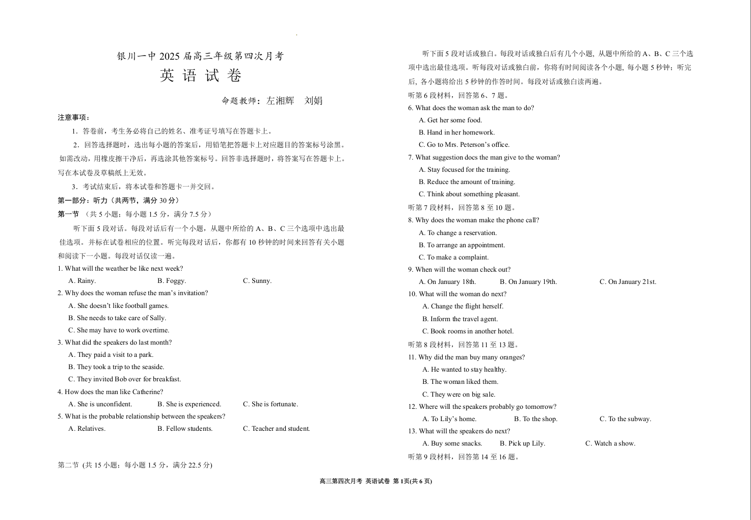 宁夏回族自治区银川一中2025届高三上学期第四次月考英语