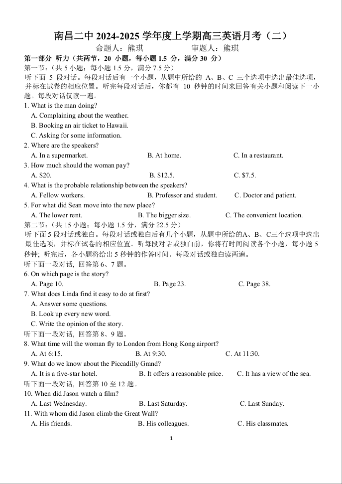 江西省南昌市第二中学2025届高三上学期月考(二)英语