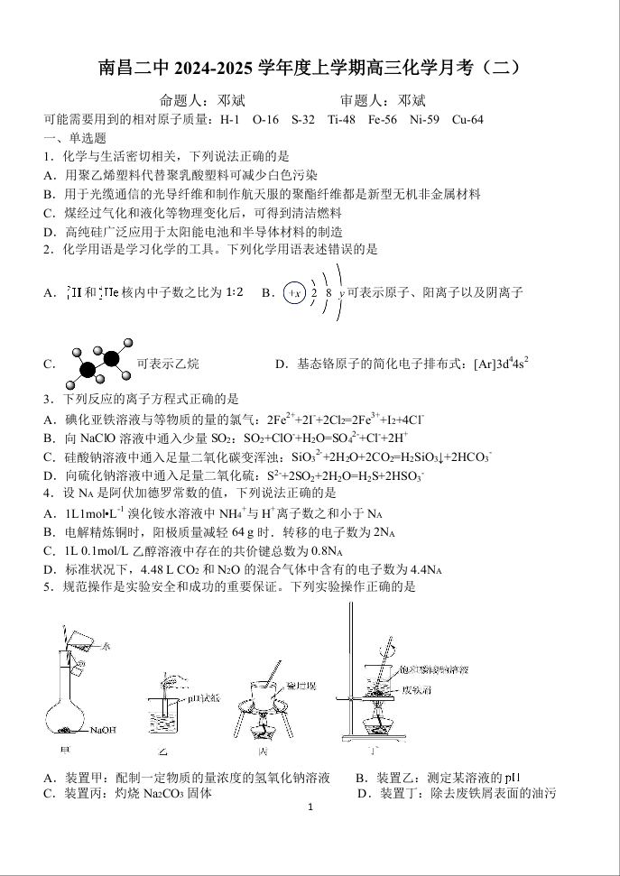 江西省南昌市第二中学2025届高三上学期月考(二)化学
