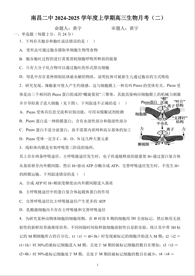 江西省南昌市第二中学2025届高三上学期月考(二)生物