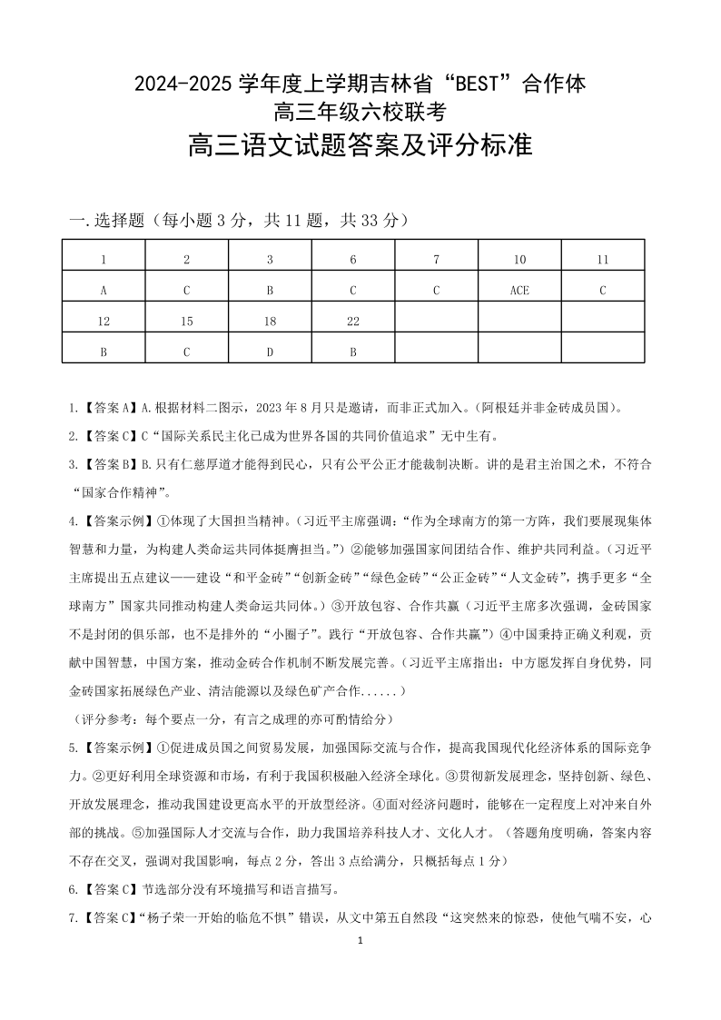 吉林省“BEST”合作体六校2025届高三上学期第三次联考语文答案