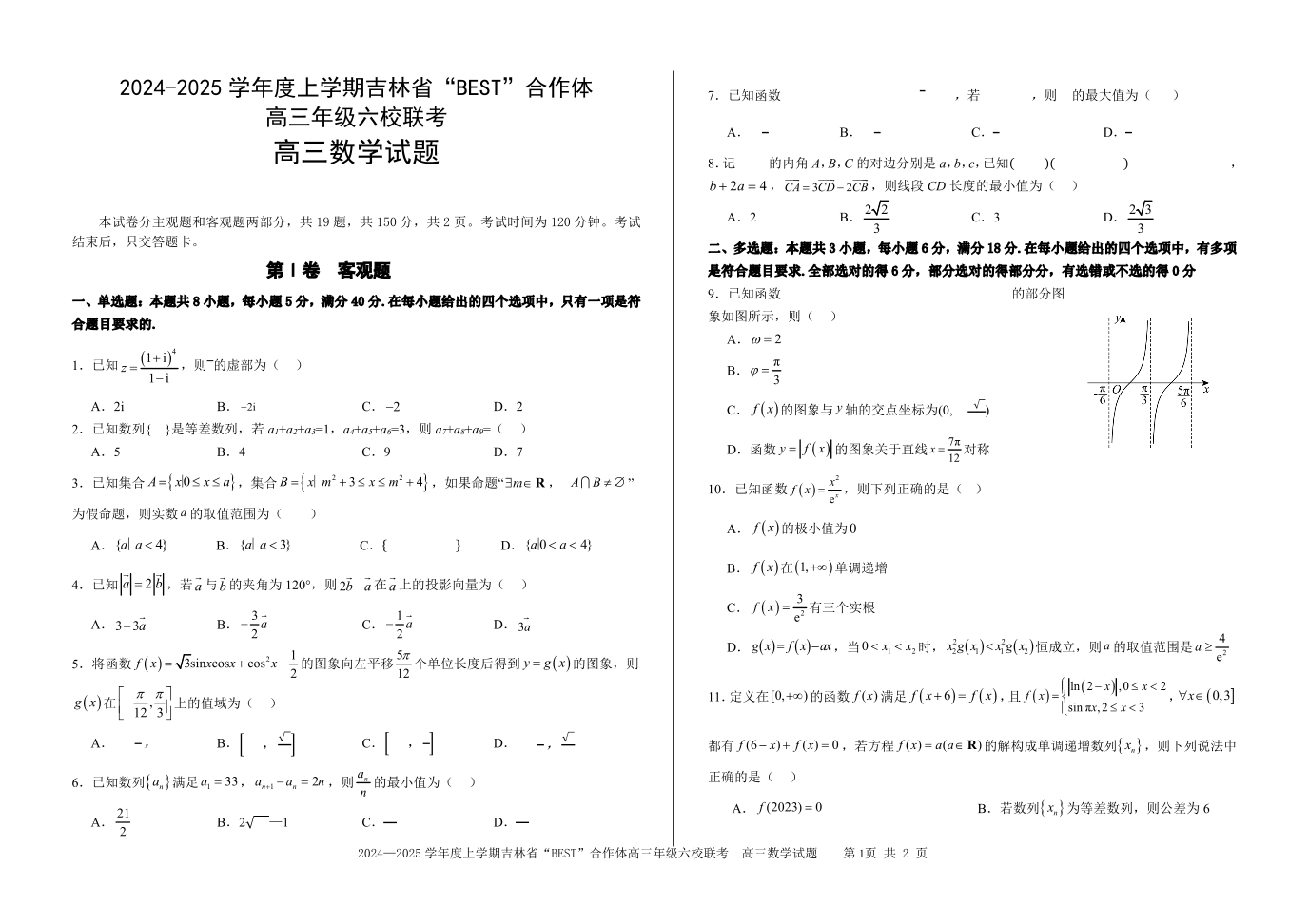 吉林省“BEST”合作体六校2025届高三上学期第三次联考数学