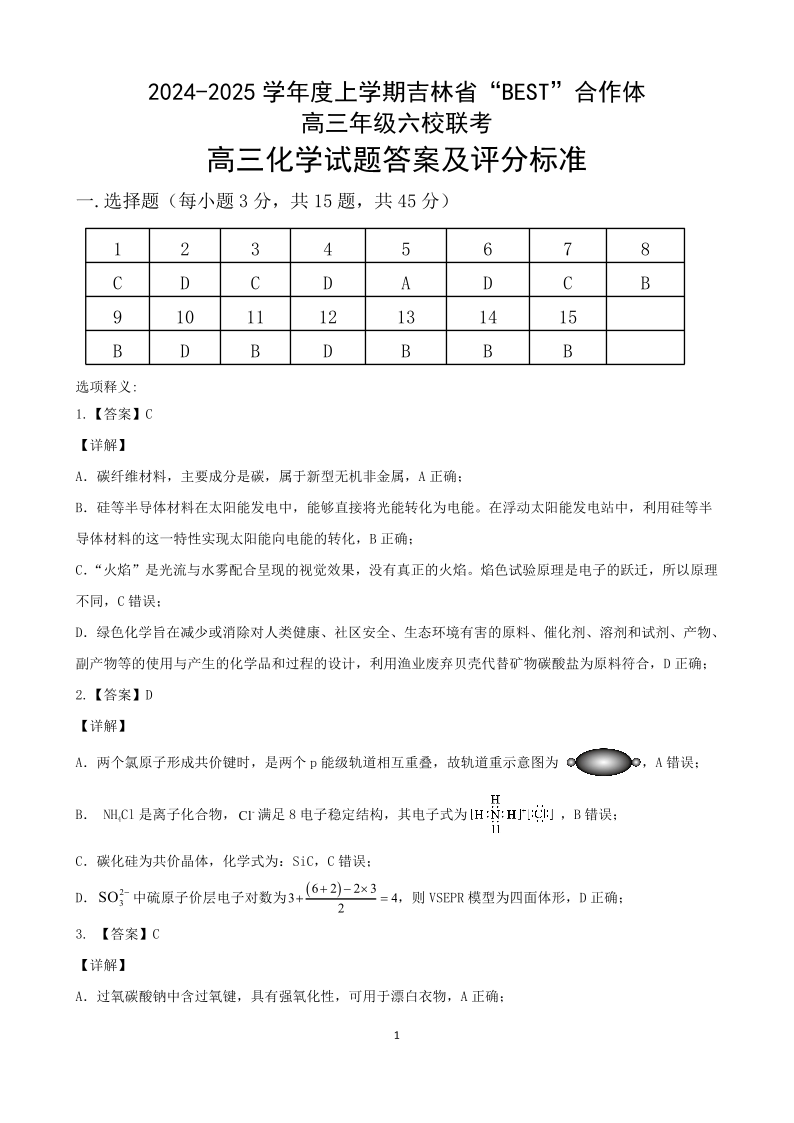 吉林省“BEST”合作体六校2025届高三上学期第三次联考化学答案