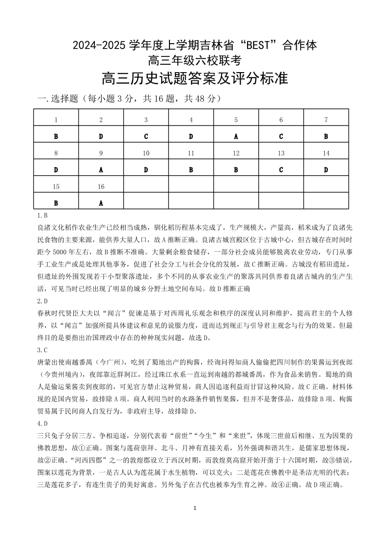 吉林省“BEST”合作体六校2025届高三上学期第三次联考历史答案
