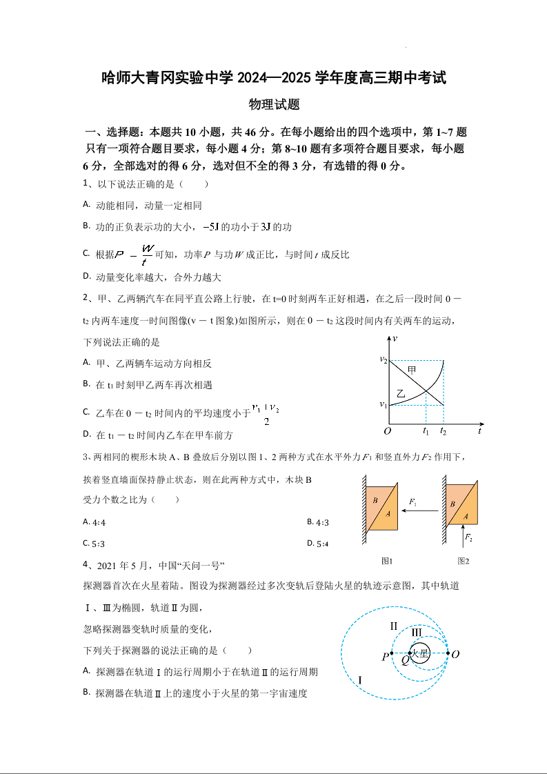 黑龙江省哈师大青冈实验中学2025届高三上学期期中考试物理+答案