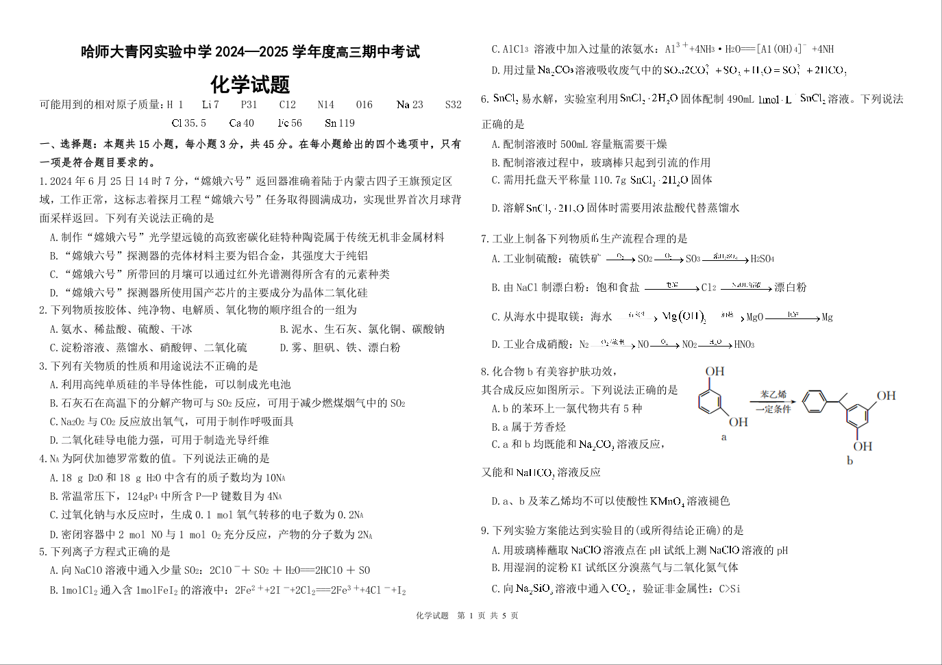 黑龙江省哈师大青冈实验中学2025届高三上学期期中考试化学+答案