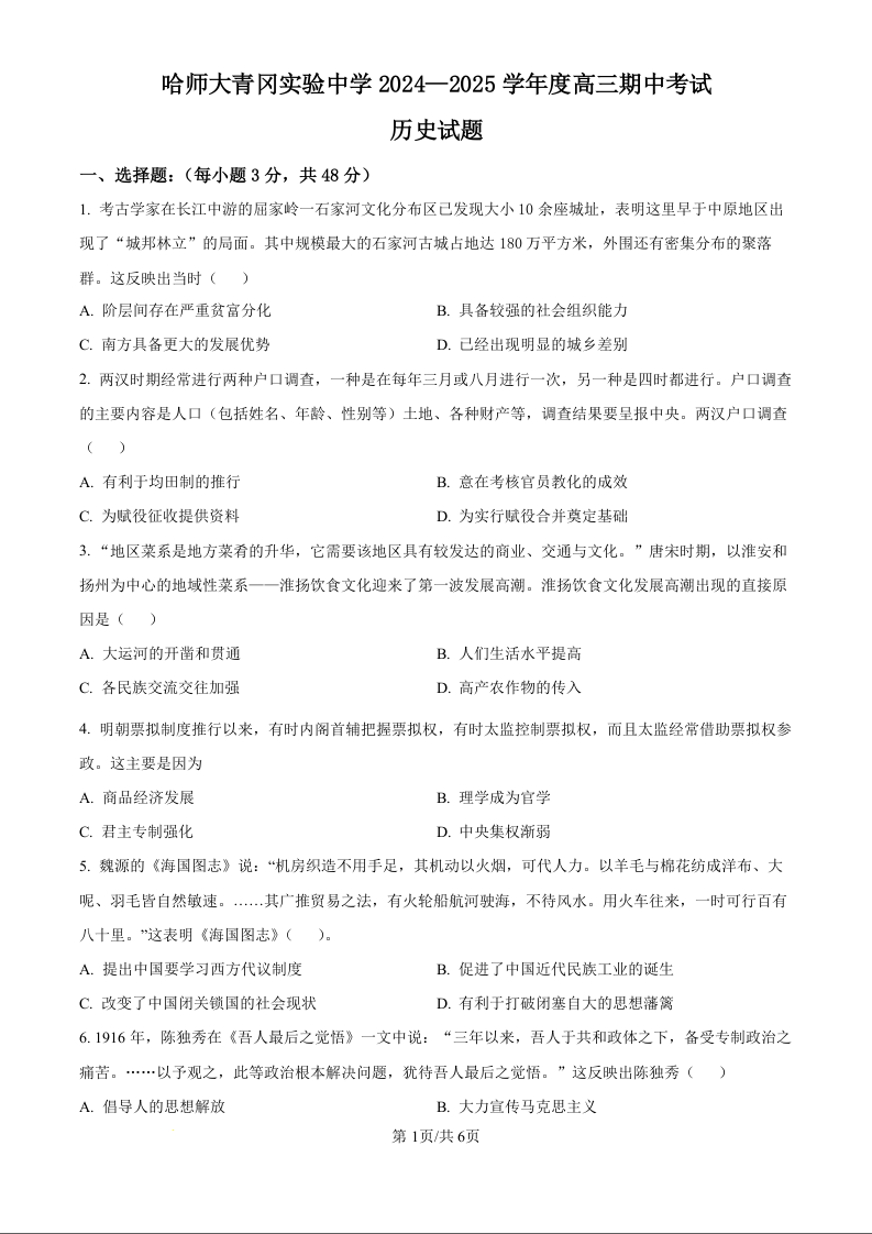 黑龙江省哈师大青冈实验中学2025届高三上学期期中考试历史(原卷版)