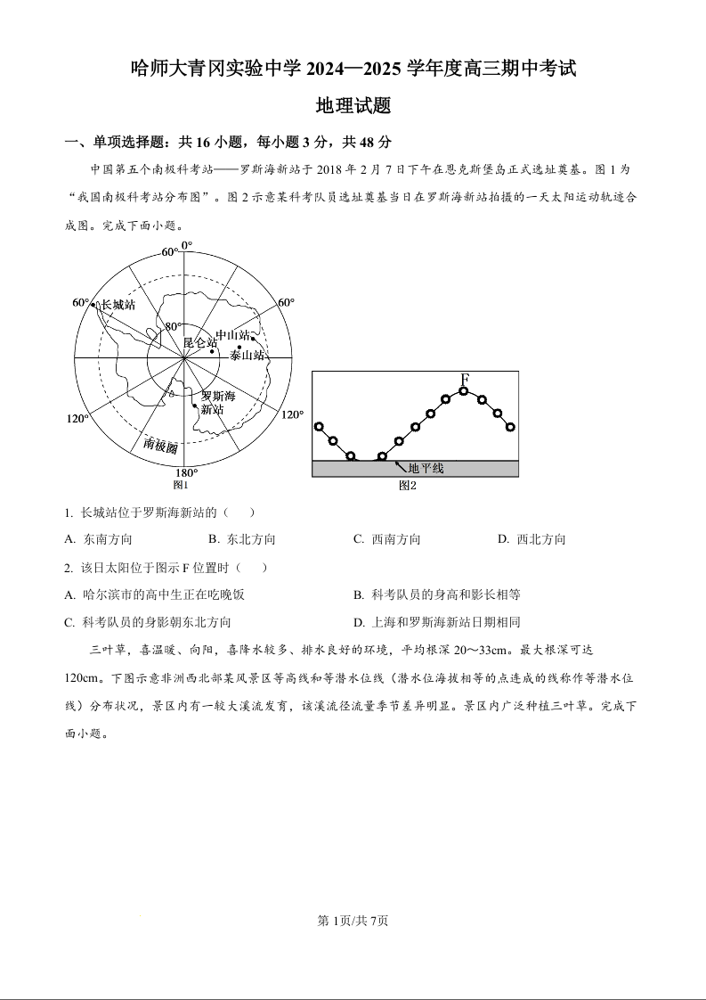 黑龙江省哈师大青冈实验中学2025届高三上学期期中考试地理(原卷版)