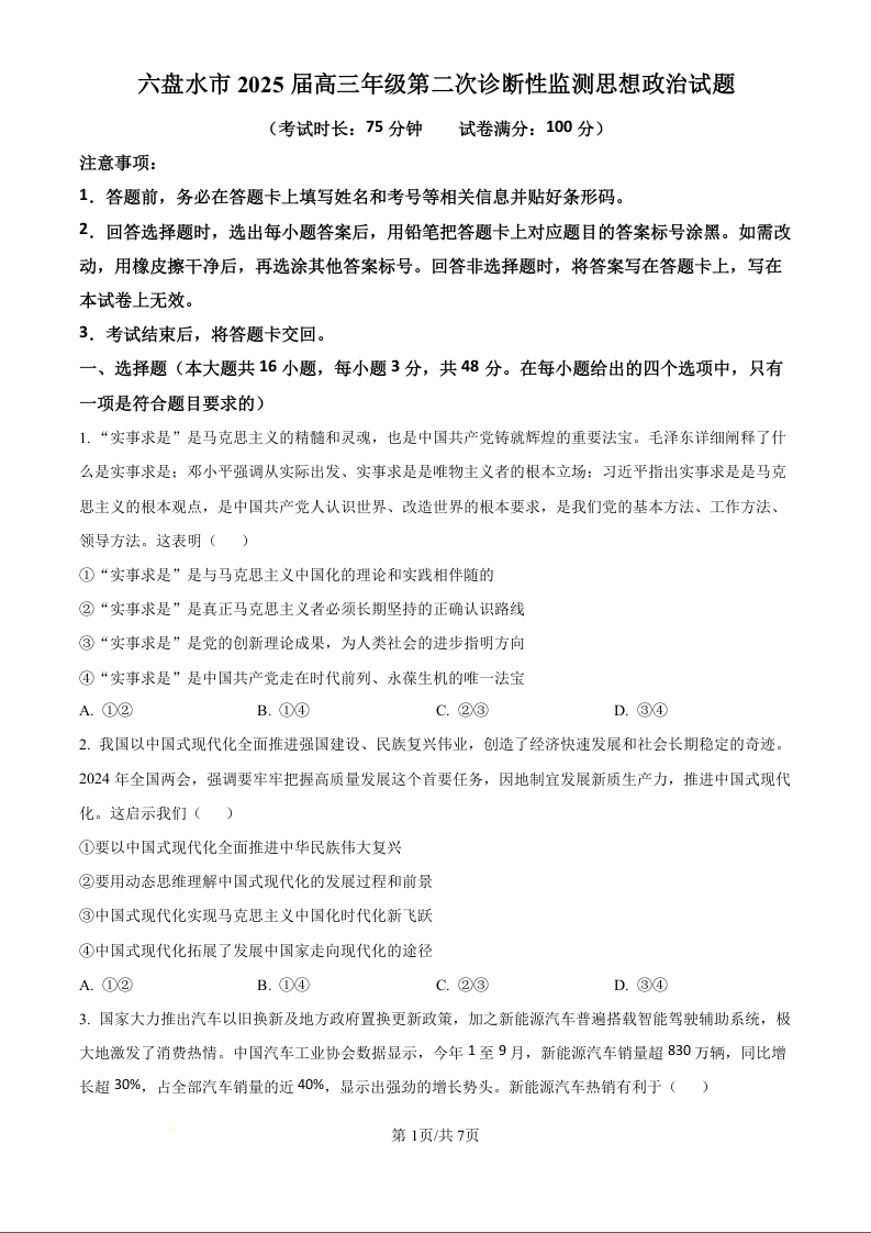 贵州省六盘水市2025届高三上学期第二次诊断性监测政治