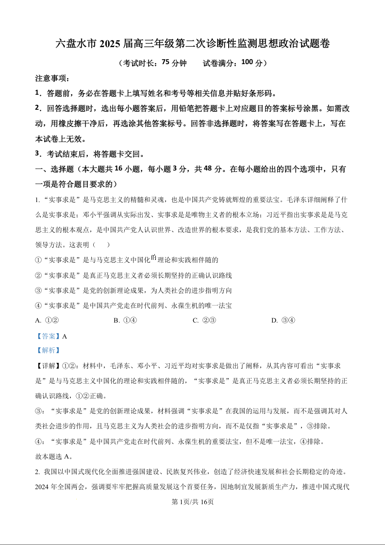贵州省六盘水市2025届高三上学期第二次诊断性监测政治答案