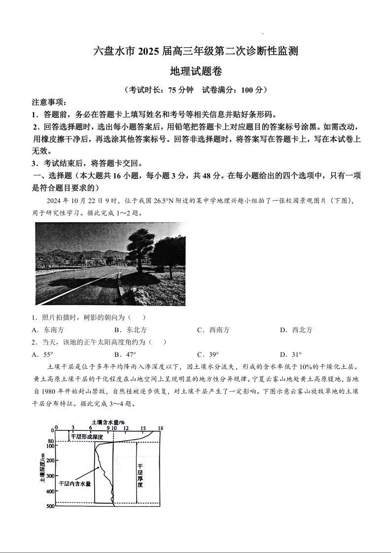 贵州省六盘水市2025届高三上学期第二次诊断性监测地理