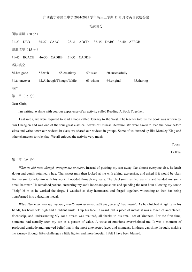 广西南宁市第二中学2025届高三上学期11月月考英语答案