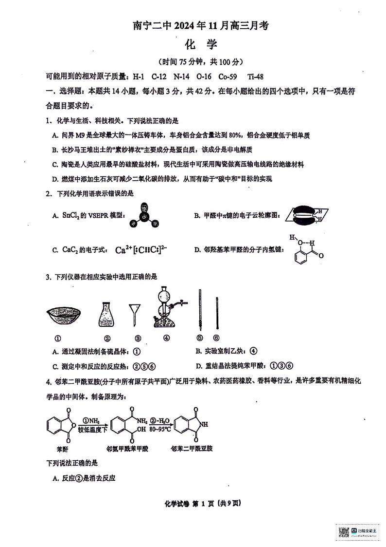 广西南宁市第二中学2025届高三上学期11月月考化学