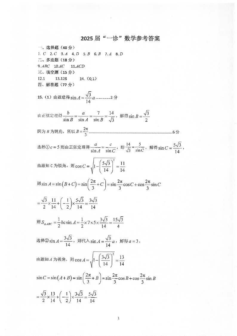 四川省自贡市普高2025届第一次诊断性考试数学答案