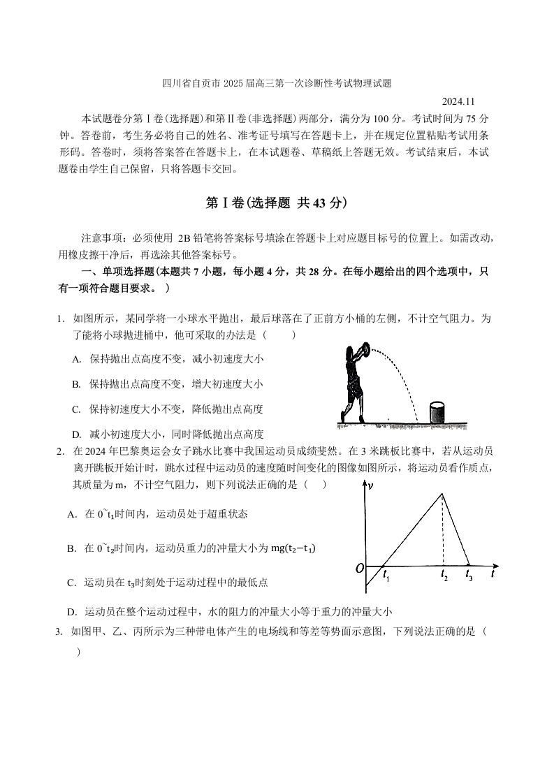 四川省自贡市普高2025届第一次诊断性考试物理+答案