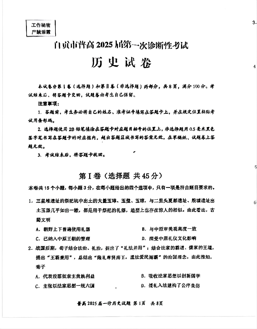 四川省自贡市普高2025届第一次诊断性考试历史