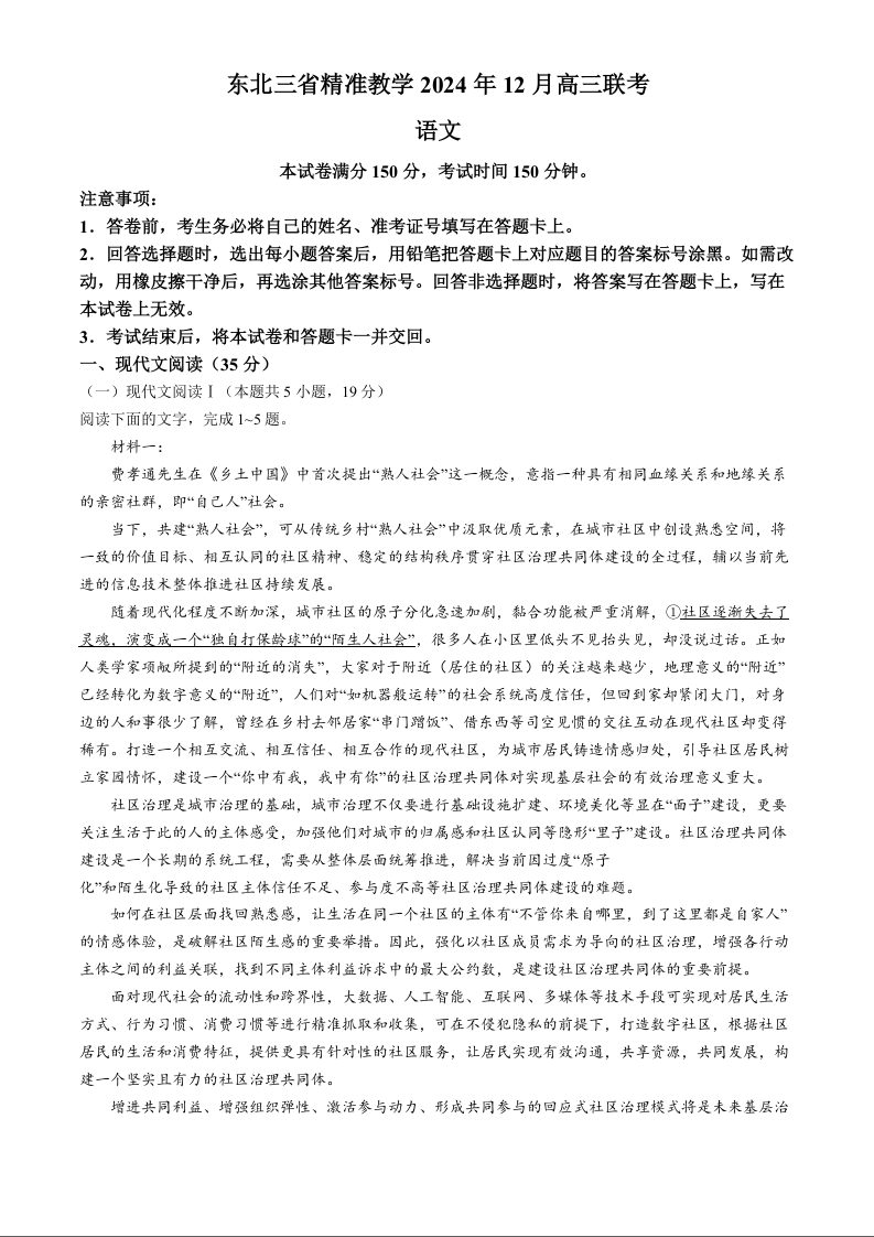 东北三省精准教学2024年12月高三联考语文+答案