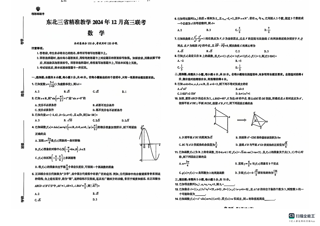 东北三省精准教学2024年12月高三联考数学