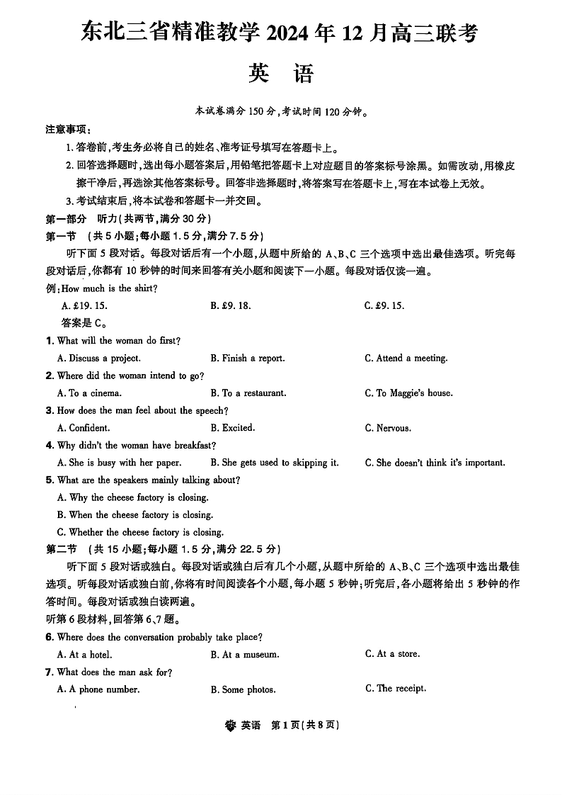 东北三省精准教学2024年12月高三联考英语+答案