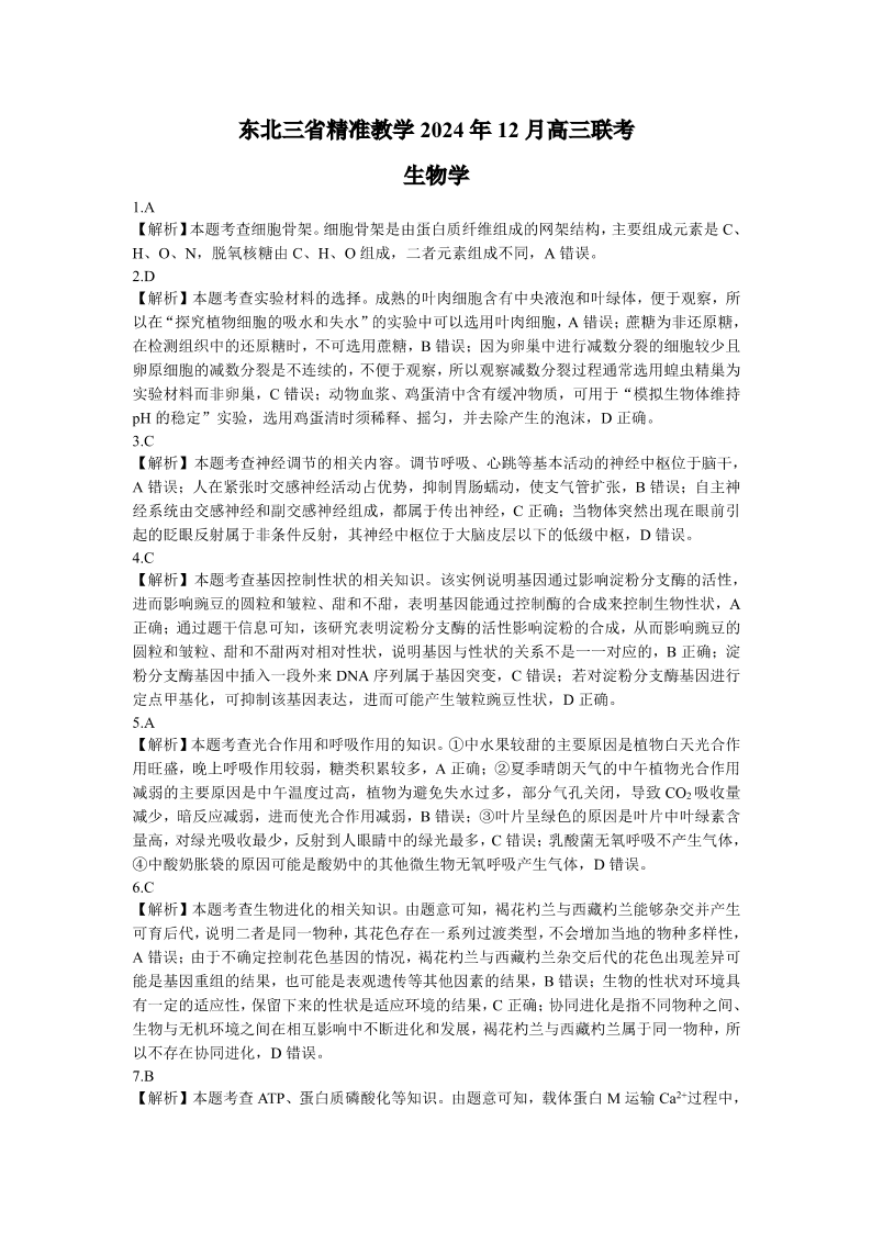 东北三省精准教学2024年12月高三联考生物解析