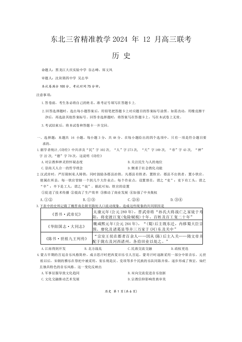 东北三省精准教学2024年12月高三联考历史+答案