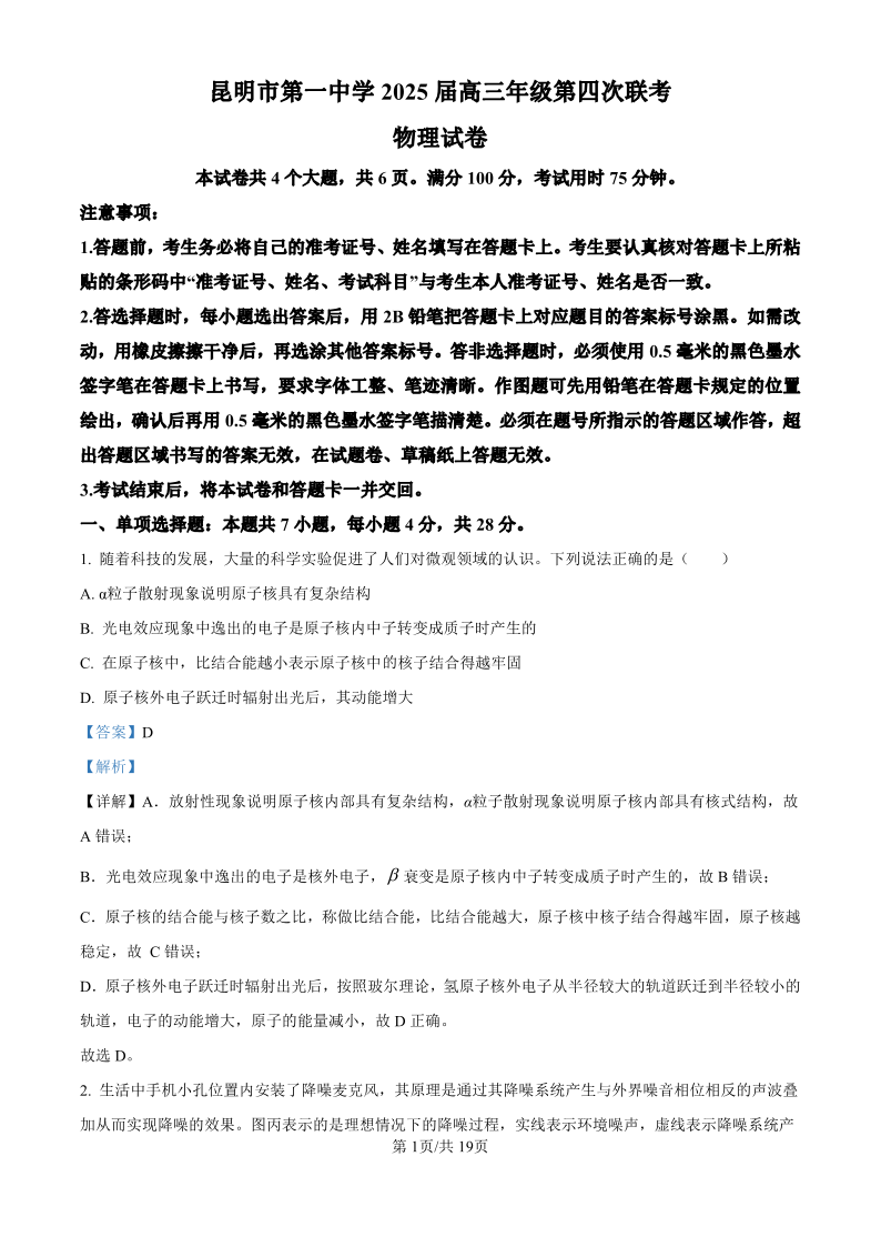 云南省昆明市第一中学2025届高三年级第四次联考物理(精品解析版)