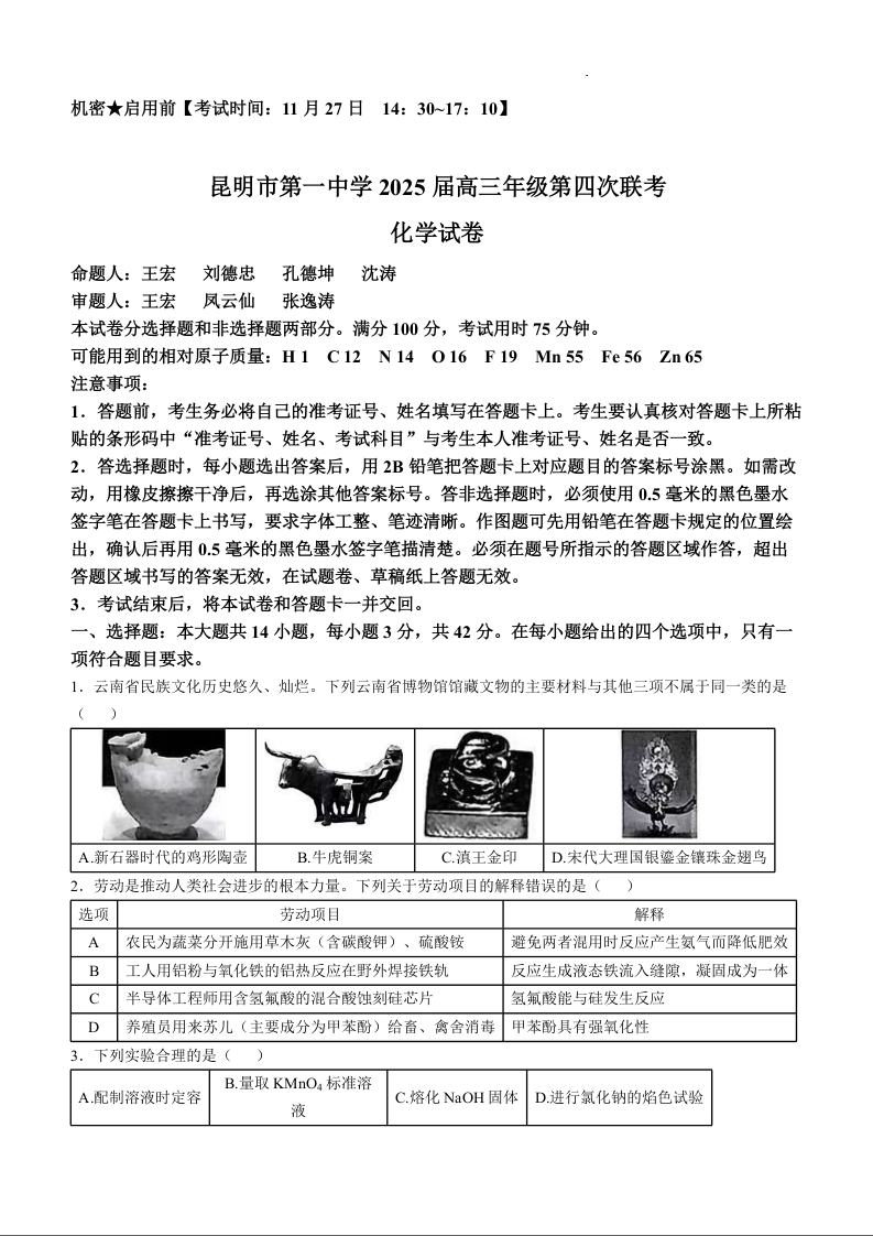云南省昆明市第一中学2025届高三年级第四次联考化学+答案