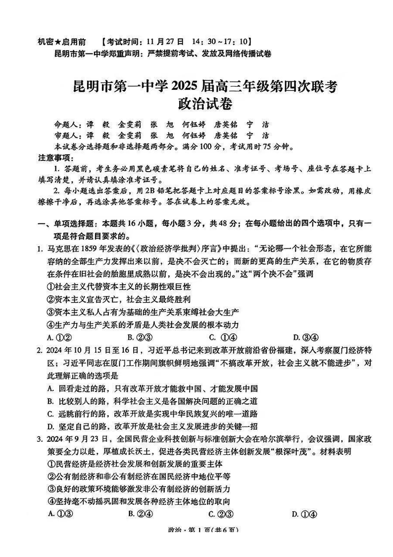 云南省昆明市第一中学2025届高三年级第四次联考政治+答案