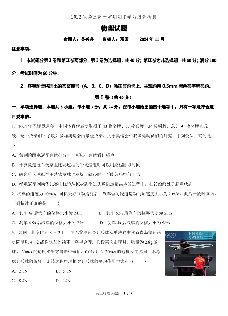 山东省淄博市临淄中学2025届高三上学期期中考试物理