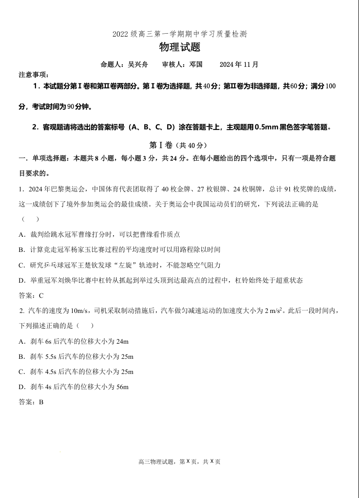 山东省淄博市临淄中学2025届高三上学期期中考试物理答案
