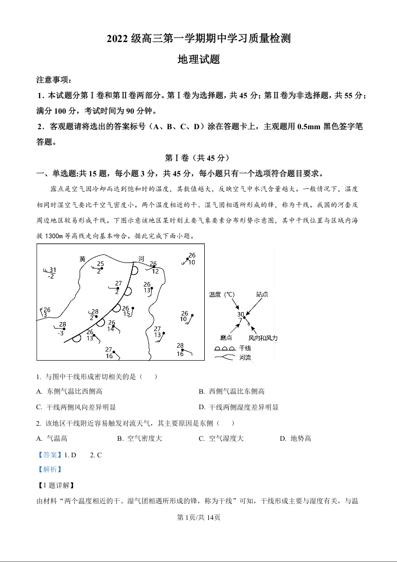 山东省淄博市临淄中学2025届高三上学期期中考试地理(精品解析版)