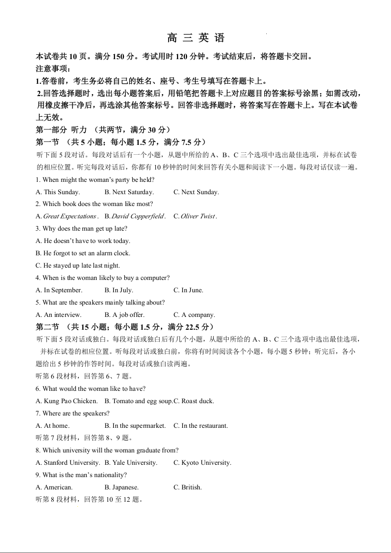 山东省威海市文登2025届高三上学期第一次模拟考试英语