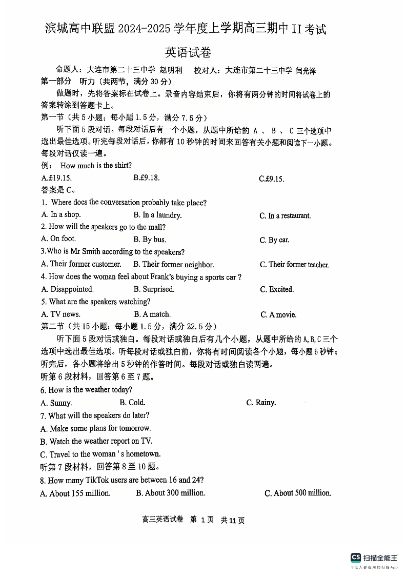 辽宁省大连市滨城高中联盟2025届高三上学期期中Ⅱ考试英语