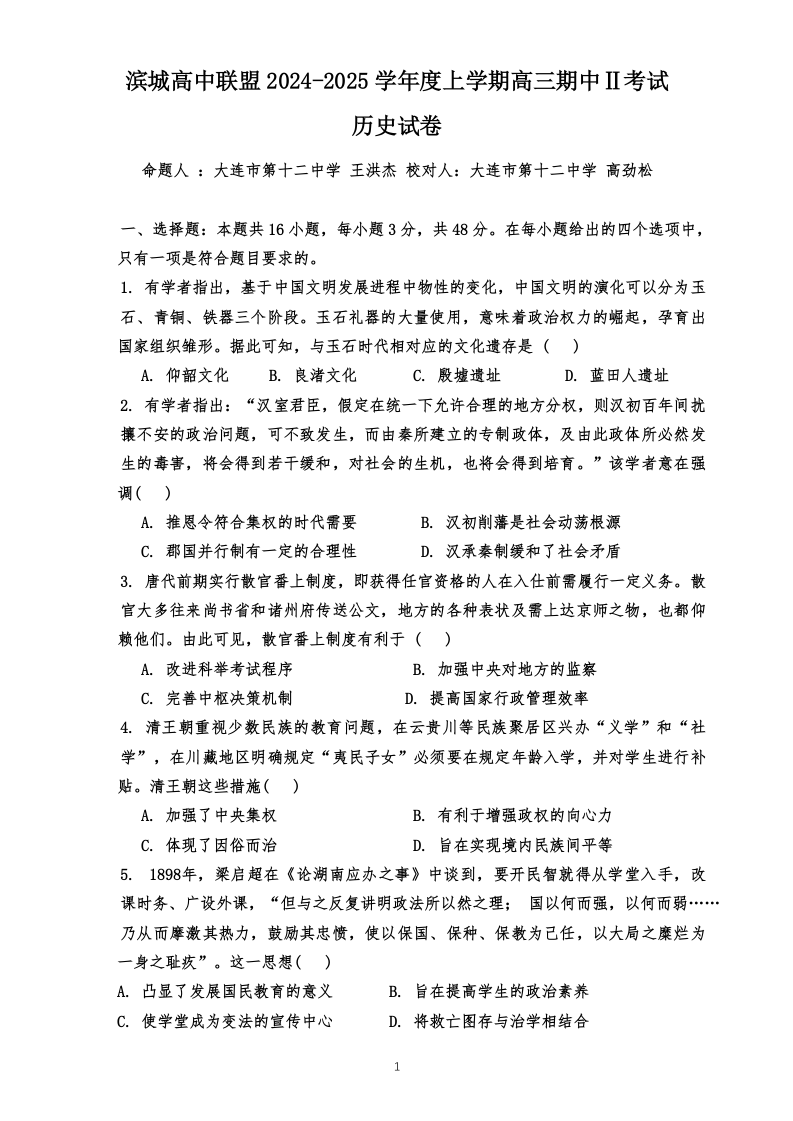 辽宁省大连市滨城高中联盟2025届高三上学期期中Ⅱ考试历史+答案