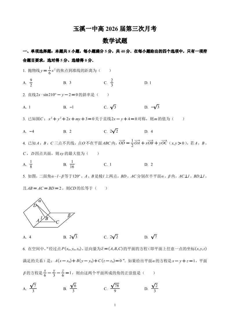 云南省玉溪市一中2024-2025学年高二上学期第三次月考数学