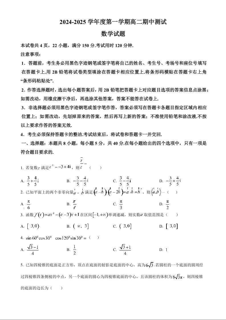 广东省阳江市高新区2024-2025学年高二上学期11月期中考试数学(原卷版)