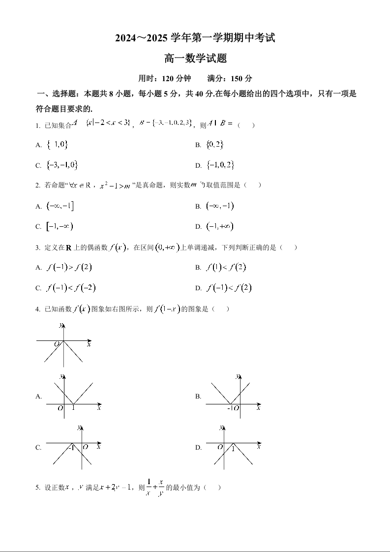 江苏省连云港市东海县2024-2025学年高一上学期期中考试数学(原卷版)