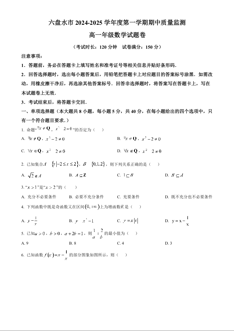 贵州省六盘水市2024-2025学年高一上学期11月期中考试数学(原卷版)