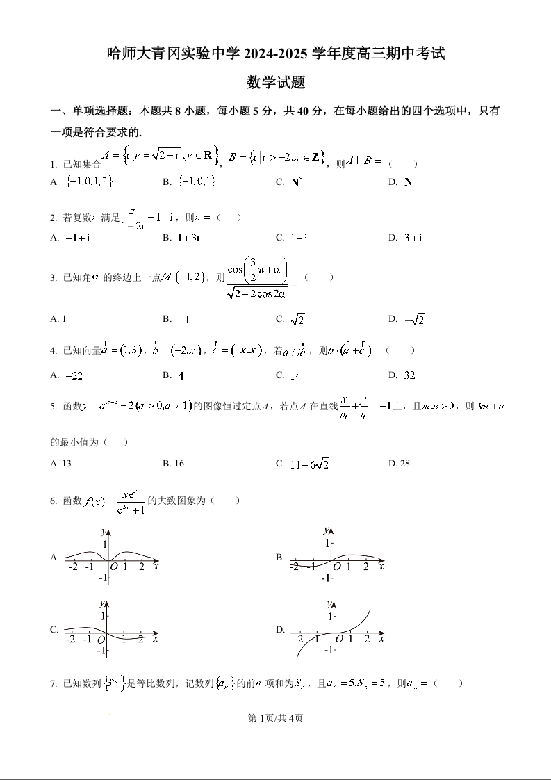 黑龙江省哈师大青冈实验中学2025届高三上学期期中考试数学(原卷版)