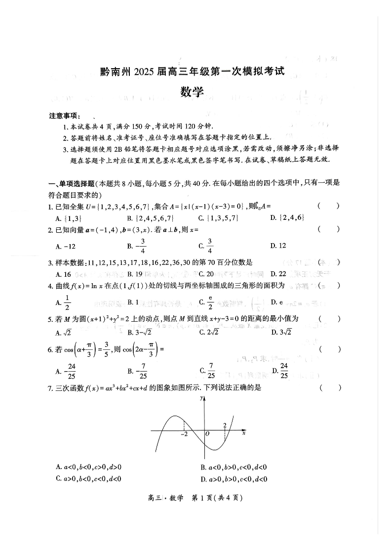 贵州省黔南州2025届高三年级第一次模拟考试数学