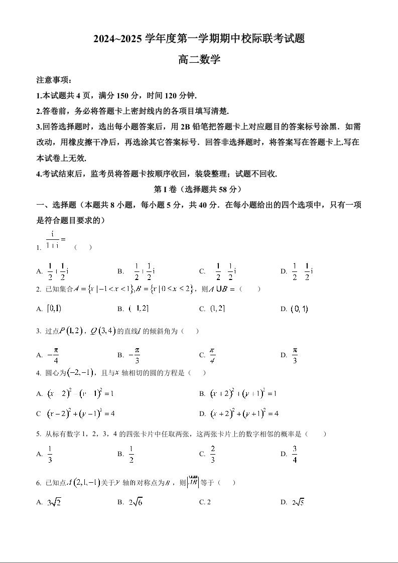 陕西省汉中市2024-2025学年高二上学期11月期中校际联考试题数学(原卷版)