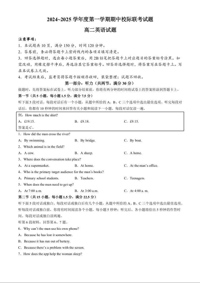陕西省汉中市2024-2025学年高二上学期11月期中校际联考试题英语 Word版含答案.