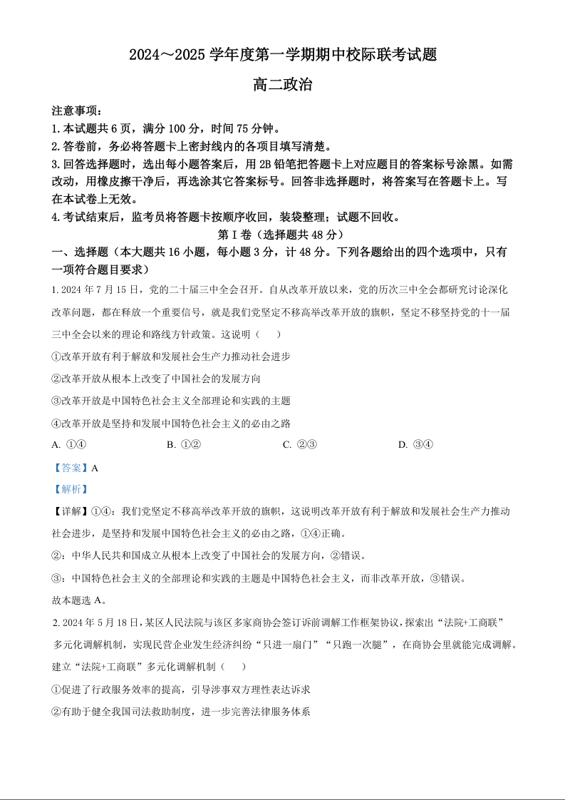 陕西省汉中市2024-2025学年高二上学期11月期中校际联考试题政治(精品解析版)