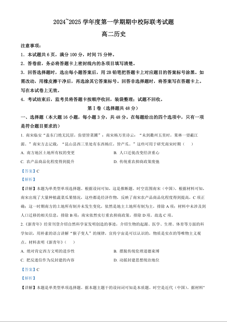 陕西省汉中市2024-2025学年高二上学期11月期中校际联考试题历史(精品解析版)