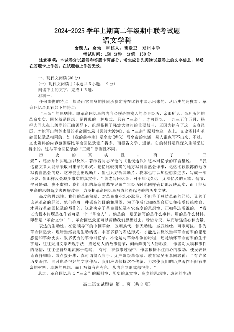 河南省郑州市十校联考2024-2025学年高二上学期11月期中考试语文