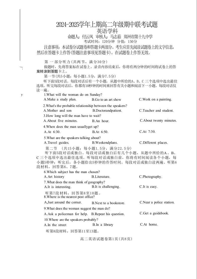 河南省郑州市十校联考2024-2025学年高二上学期11月期中考试英语