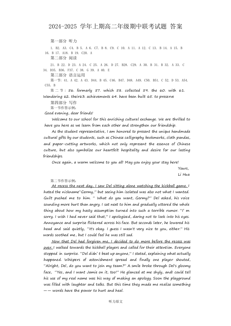 河南省郑州市十校联考2024-2025学年高二上学期11月期中考试英语答案
