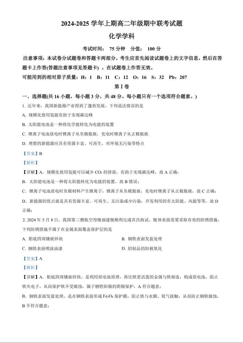 河南省郑州市十校联考2024-2025学年高二上学期11月期中考试化学(精品解析版)